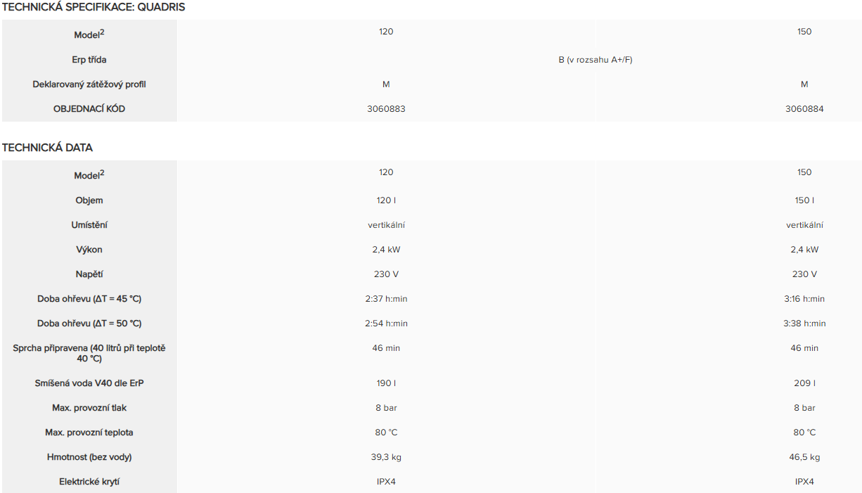 Bojler Ariston Quadris 150 WiFi FR EU představuje efektivní a chytré řešení pro ohřev vody ve středně velkých domácnostech. S kapacitou 150 litrů zajišťuje dostatek teplé vody pro každodenní potřeby vaší rodiny. Inovativní technologie Eco Evo optimalizuje spotřebu energie, což přináší úsporu nákladů až 15 %. Prostřednictvím Wi-Fi připojení lze bojler bez problémů ovládat prostřednictvím aplikace Ariston NET. Kombinace moderního designu a chytrých funkcí činí bojler Ariston Quadris 150 WiFi FR EU skvělou volbou pro každou domácnost, která klade důraz na pohodlí a úsporu energie.