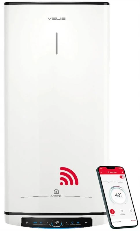 Ariston Velis PRO Wi-Fi 80 EU je vybaven intuitivním ovládacím panelem, který umožňuje snadné sledování a úpravy teploty a ohřevu vody. Díky bezplatné aplikaci Ariston NET, dostupné pro zařízení Apple a Android, získáte plnou kontrolu nad bojlerem přímo ze svého chytrého telefonu. Aplikace vám umožňuje přizpůsobit teplotní režimy, nastavit topné plány a sledovat spotřebu energie pro optimalizaci nákladů a zajištění většího pohodlí.