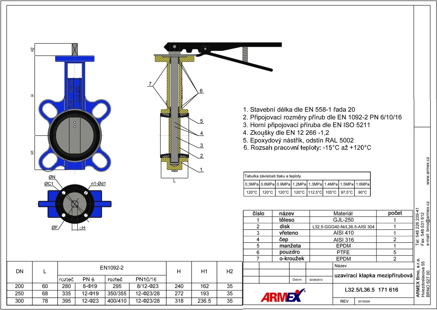 Armex Mezipřírubová uzavírací klapka DN 150 PN16 L32.5 171 616 litinový disk
