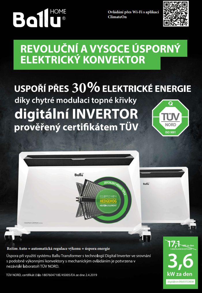 Ballu Rapid-2200 je perfektním řešením pro rychlé zahřátí a využívá proudění vzduchu k vytápění. Díky vestavěnému digitálnímu invertoru Rapid reguluje nastavenou teplotu plně automaticky od + 5 °C do 35 °C plynule v závislosti na rozdílu mezi cílovou a skutečnou teplotou v místnosti. To vám přináší úsporu energie až 30 % ve srovnání s běžnými konvektory. Konvektor Rapid nespaluje prach ani kyslík. HEDGEHOG je tiché monolitické topné těleso nové generace, které je o 20 % kompaktnější a účinnější než standardní topná tělesa, takže místnost vytopíte rychle a efektivně.