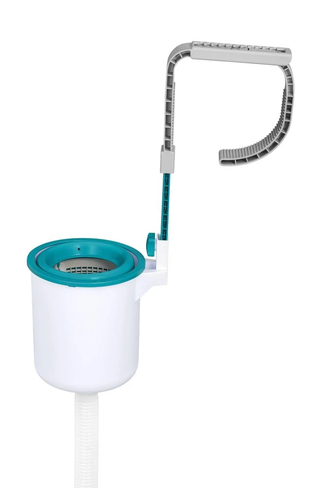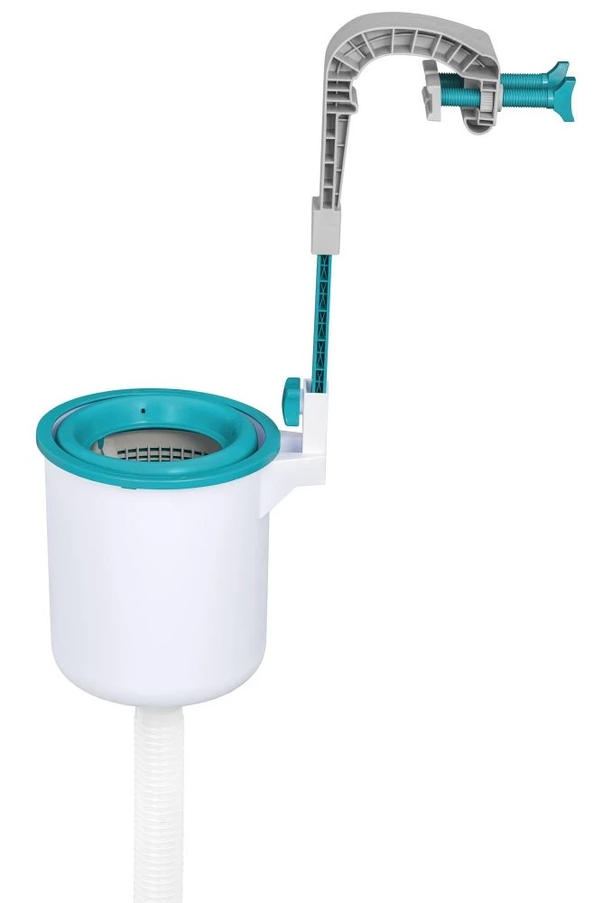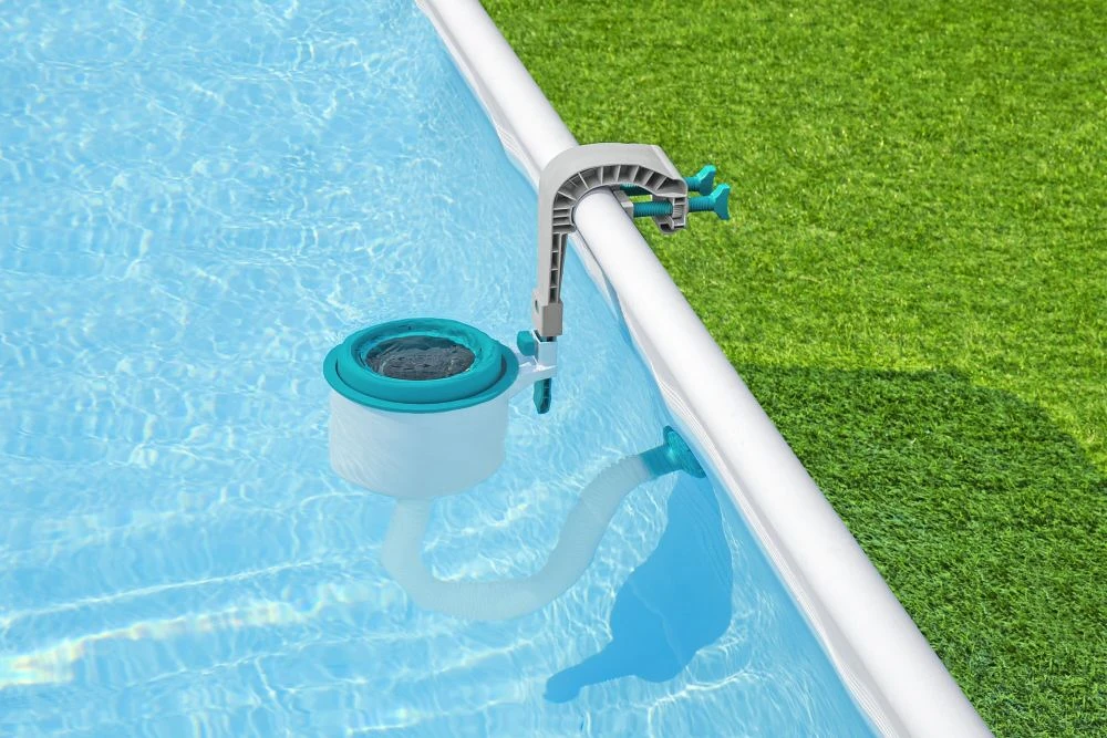 Bazénový skimmer se velmi jednoduchým způsobem upevní na okraj bazénu. K tomu jsou u každého skimmeru 2 druhy nástavců (pro bazény s nafukovacím okrajem a druhý je určen pro bazény s kovovou konstrukcí, v balení jsou oba dva typy upevnění).