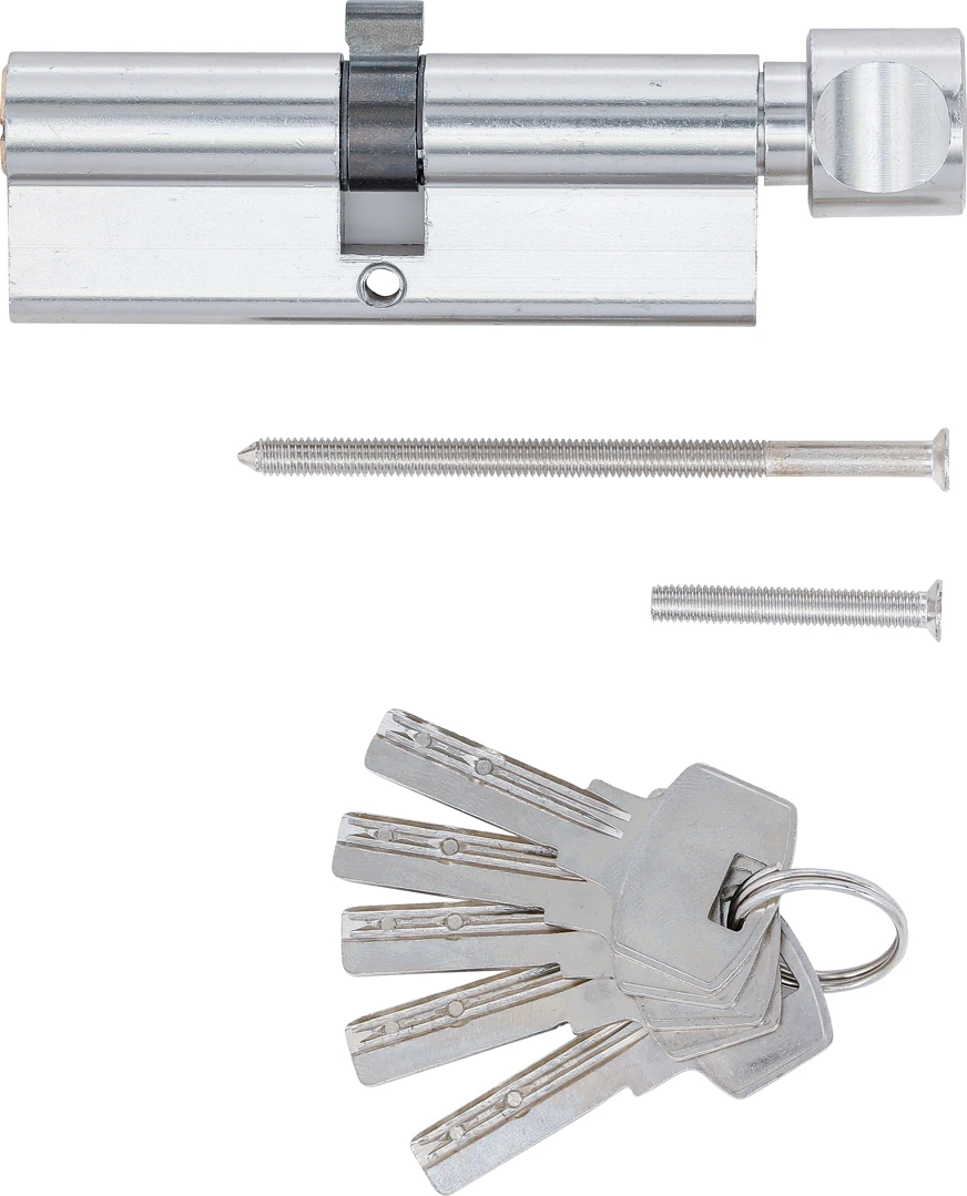 Bezpečnostní cylindrický zámek s otočným knoflíkem, 90 mm, 45/45 mm - BGS 85290 Bezpečnostní cylindrický zámek je vhodný pro dveře domu, bytu, kanceláře nebo provozovny a nabízí pohodlné každodenní používání. Délka 90 mm, 5 klíčů v balení, vnitřní otočný knoflík pro rychlé zamknutí.
