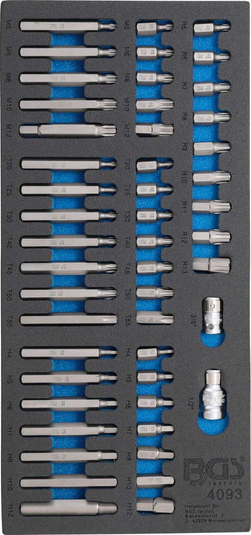 Pěnová vložka (modul) bity (imbus, TORX, XZN, RIBE), sada 49 dílů - BGS 4093 značky BGS je praktická pěnová vložka do montážního vozíku pro přehledné uložení nářadí. Pomáhá udržet pořádek v zásuvkách, zrychluje práci a chrání nástroje proti poškození. Ideální pro autoservis i dílnu, kde se počítá rychlost a organizace.