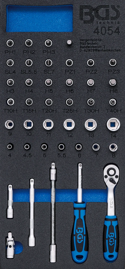 Pěnová vložka (modul) gola sada 1/4", sada 41 dílů – BGS 4054 značky BGS je kvalitní gola nářadí určené pro autoservis, dílnu i náročné montáže. Oblíbené mezi mechaniky jako spolehlivá gola / ráčna výbava na šrouby, matice i práci pod kapotou. Vhodné pro profi dílnu i domácí kutily, kteří chtějí pevné heavy‑duty provedení a dlouhou životnost.