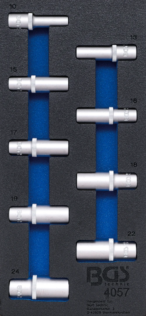Pěnová vložka (modul) hlavice nástrčné 1/2" 10-24 mm, šestihran. prodloužené, sada 9 dílů značky BGS je praktická pěnová vložka do montážního vozíku pro přehledné uložení nářadí. Pomáhá udržet pořádek v zásuvkách, zrychluje práci a chrání nástroje proti poškození. Ideální pro autoservis i dílnu, kde se počítá rychlost a organizace.