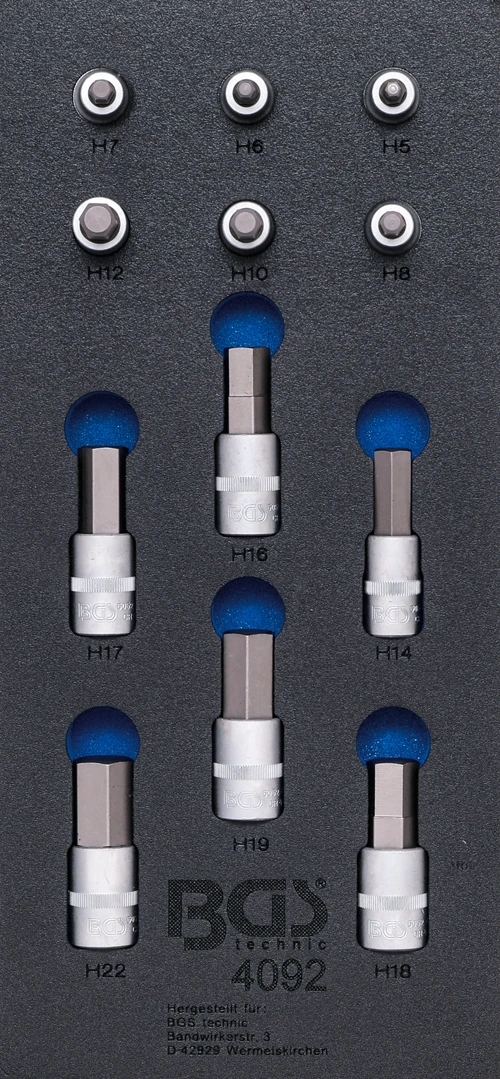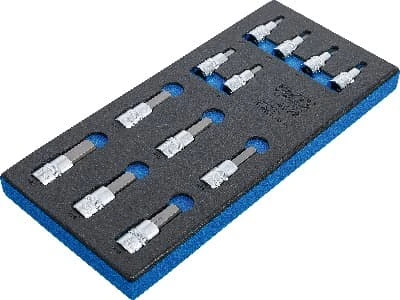 Pěnová vložka (modul) Hlavice zástrčné - vnitřní šestihran, sada 12 dílů - BGS 4092 značky BGS je praktická pěnová vložka do montážního vozíku pro přehledné uložení nářadí. Pomáhá udržet pořádek v zásuvkách, zrychluje práci a chrání nástroje proti poškození. Ideální pro autoservis i dílnu, kde se počítá rychlost a organizace.
