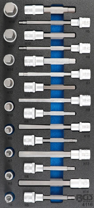 Pěnová vložka (modul) Hlavice zástrčné - vnitřní šestihran, sada 24 dílů - BGS 4116 značky BGS je praktická pěnová vložka do montážního vozíku pro přehledné uložení nářadí. Pomáhá udržet pořádek v zásuvkách, zrychluje práci a chrání nástroje proti poškození. Ideální pro autoservis i dílnu, kde se počítá rychlost a organizace.