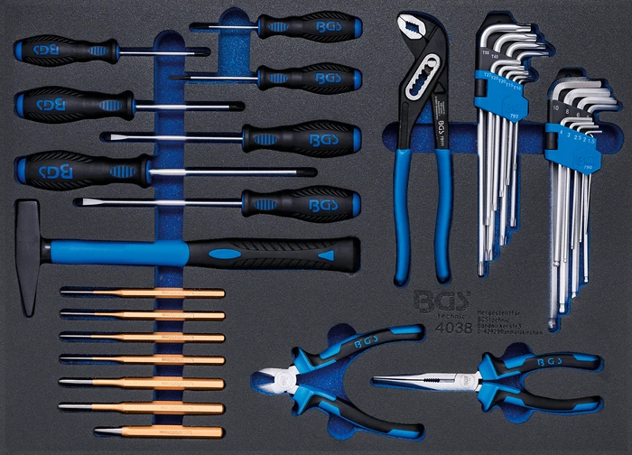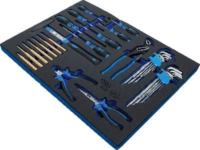 Pěnová vložka (modul) kladivo, kleště, šroubováky, 36 dílů - BGS 4038 značky BGS je praktická pěnová vložka do montážního vozíku pro přehledné uložení nářadí. Pomáhá udržet pořádek v zásuvkách, zrychluje práci a chrání nástroje proti poškození. Ideální pro autoservis i dílnu, kde se počítá rychlost a organizace.
