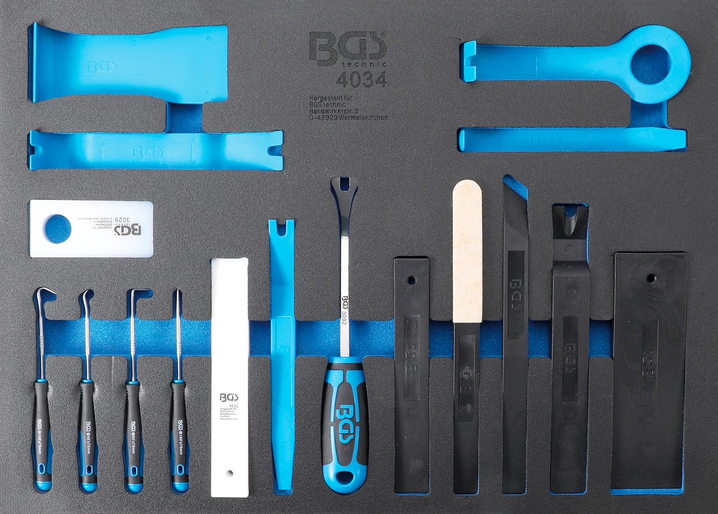 Pěnová vložka (modul) přípravky pro montáž a demontáž čalounění - BGS 4034 značky BGS je praktická pěnová vložka do montážního vozíku pro přehledné uložení nářadí. Pomáhá udržet pořádek v zásuvkách, zrychluje práci a chrání nástroje proti poškození. Ideální pro autoservis i dílnu, kde se počítá rychlost a organizace.