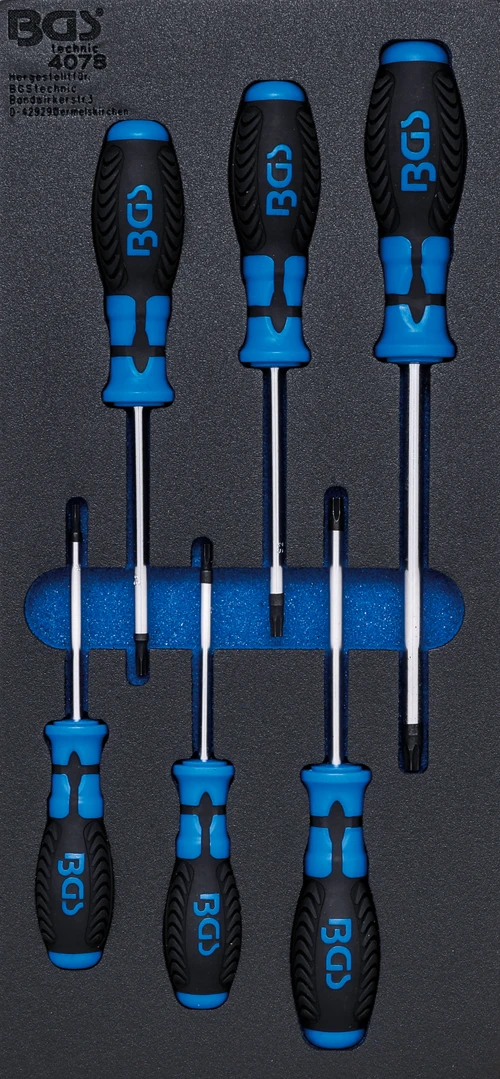 Pěnová vložka (modul) šroubováky T-profil T15-T40, 6 dílů - BGS 4078 značky BGS je praktická pěnová vložka do montážního vozíku pro přehledné uložení nářadí. Pomáhá udržet pořádek v zásuvkách, zrychluje práci a chrání nástroje proti poškození. Ideální pro autoservis i dílnu, kde se počítá rychlost a organizace.