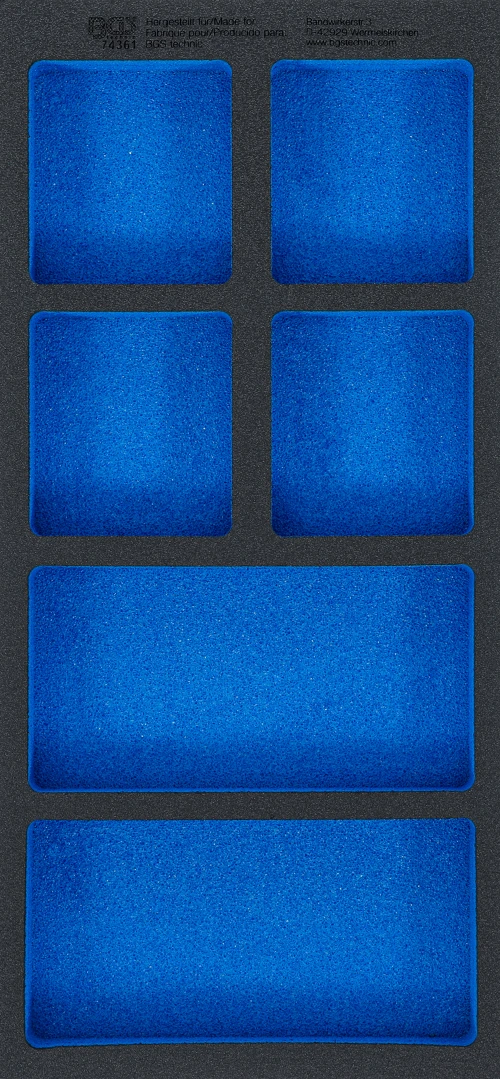Pěnová vložka (modul) do dílenského vozíku 1/3, prázdná: 6 odkládací přihrádky , 408 x 189 značky BGS je profesionální pěnová vložka určená pro přehledné uspořádání nářadí v zásuvkách montážního vozíku. Pomáhá udržet pořádek, chrání nástroje a zvyšuje efektivitu práce v autoservisu i dílně.