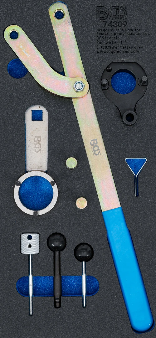 Vložka do dílenského vozíku 1/3: souprava nářadí k nastavení motoru , pro VAG 2.0 TDI Com je profesionální přípravek pro nastavení a aretaci rozvodů motoru. Určeno pro přesné časování vačkových a klikových hřídelí při výměně rozvodového řemene nebo řetězu. Vhodné pro autoservisy i náročné mechaniky, kteří vyžadují přesnost a bezpečnost práce.