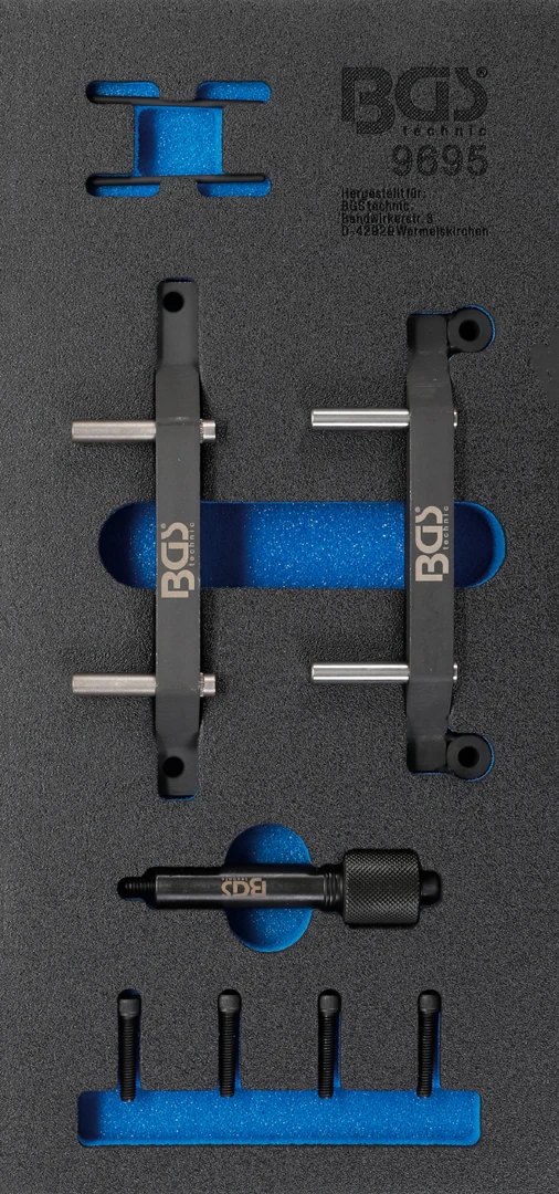 Pěnová vložka (modul) Souprava nářadí k nastavení motoru, pro Jeep 3.0 V6 Diesel, 9dílná – značky BGS je praktická pěnová vložka do montážního vozíku pro přehledné uložení nářadí. Zrychlí práci díky jasnému rozložení, chrání nástroje a pomůže hned poznat, když něco chybí. Skvělé řešení pro autoservis i dílnu, kde se počítá pořádek a efektivita.