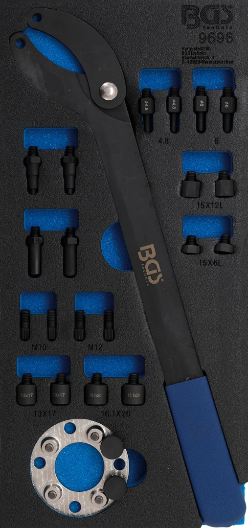 Pěnová vložka (modul) Souprava nářadí k přidržování vačkových hřídelí, pro VAG – BGS 9696 značky BGS je praktická pěnová vložka do montážního vozíku pro přehledné uložení nářadí. Zrychlí práci díky jasnému rozložení, chrání nástroje a pomůže hned poznat, když něco chybí. Skvělé řešení pro autoservis i dílnu, kde se počítá pořádek a efektivita.