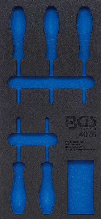 Pěnová vložka (modul) do dílenského vozíku 1/3, prázdná, pro 4076 – BGS 4076-1 značky BGS je profesionální pěnová vložka určená pro přehledné uspořádání nářadí v zásuvkách montážního vozíku. Pomáhá udržet pořádek, chrání nástroje a zvyšuje efektivitu práce v autoservisu i dílně.
