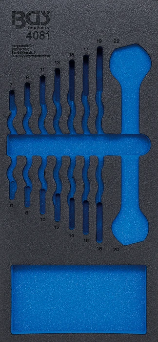 Pěnová vložka (modul) do dílenského vozíku 1/3, prázdná, pro 4081 – BGS 4081-1 značky BGS je profesionální pěnová vložka určená pro přehledné uspořádání nářadí v zásuvkách montážního vozíku. Pomáhá udržet pořádek, chrání nástroje a zvyšuje efektivitu práce v autoservisu i dílně.