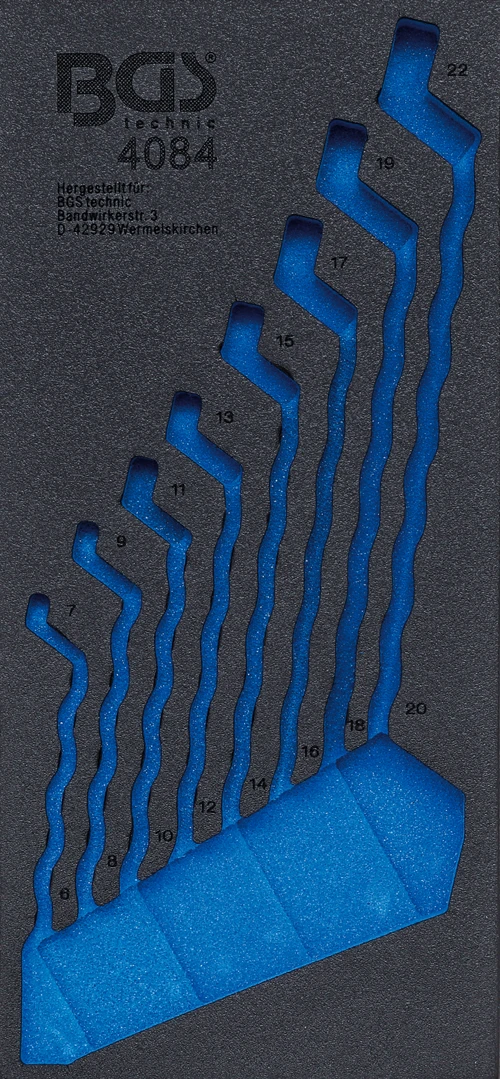 Pěnová vložka (modul) do dílenského vozíku 1/3, prázdná, pro 4084 – BGS 4084-1 značky BGS je profesionální pěnová vložka určená pro přehledné uspořádání nářadí v zásuvkách montážního vozíku. Pomáhá udržet pořádek, chrání nástroje a zvyšuje efektivitu práce v autoservisu i dílně.