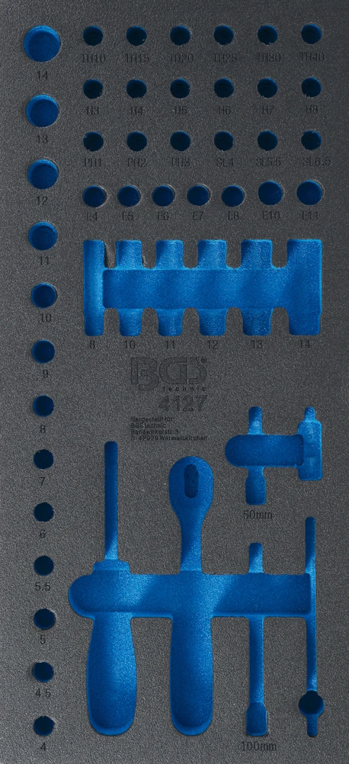 Pěnová vložka (modul) do dílenského vozíku 1/3, prázdná, pro BGS 4127 – BGS 4127-1 značky BGS je profesionální pěnová vložka určená pro přehledné uspořádání nářadí v zásuvkách montážního vozíku. Pomáhá udržet pořádek, chrání nástroje a zvyšuje efektivitu práce v autoservisu i dílně.