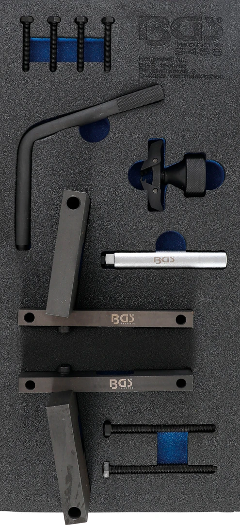 Vložka do dílenského vozíku 1/3: souprava nářadí k nastavení motoru, pro BMW S65 - BGS 945 je profesionální přípravek pro nastavení a aretaci rozvodů motoru. Určeno pro přesné časování vačkových a klikových hřídelí při výměně rozvodového řemene nebo řetězu. Vhodné pro autoservisy i náročné mechaniky, kteří vyžadují přesnost a bezpečnost práce.