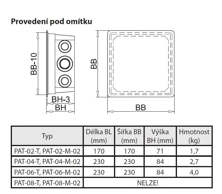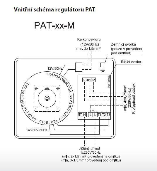 hodnota úbytku cca 0,5 V). Regulátor otáček (PAT-xx-T resp. PAT-xx-M) v provedení na omítku připojit dvoužilovým kabelem 2x1,5 mm2 na jištěný přívod - jistič D6A (jištěné vedení). Regulátor otáček (PAT-xx-M resp. PAT-xx-T) v provedení k instalaci pod omítku připojit třížilovým kabelem 3x1,5 mm2 (např. CYKY-O-3x1,5 – zemnící svorka je součástí regulátoru) na jištěný přívod – jistič D6A. Regulátor otáček RAU připojit třížilovým kabelem 3 x 1,0 mm2 na jištěný přívod – jistič B6A. Uvnitř regulátoru otáček PAT je umístěna trubičková pojistka pro jištění vlastních obvodů. Kabel pro připojení ovládacího prvku – přepínače otáček, termostatu s přepínačem otáček 5x0,75 mm2. Při použití termoelektrického pohonu 6x0,75mm2.