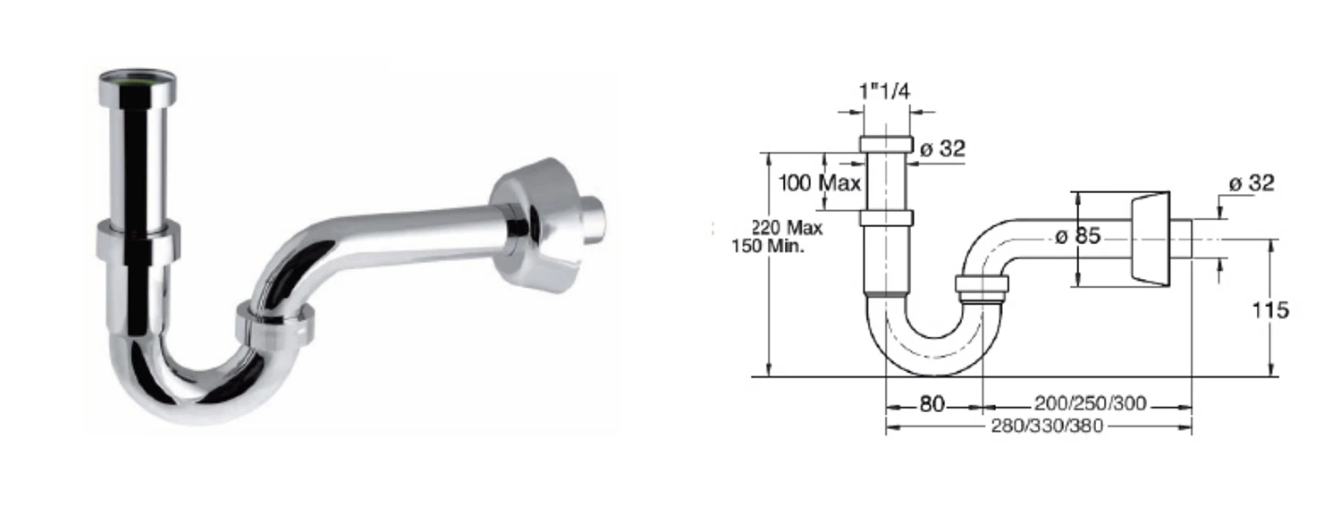 Umyvadlový sifon pro optimální připojení na stěnu a k umyvadlu, s pryžovým těsněním. Součástí je odp...