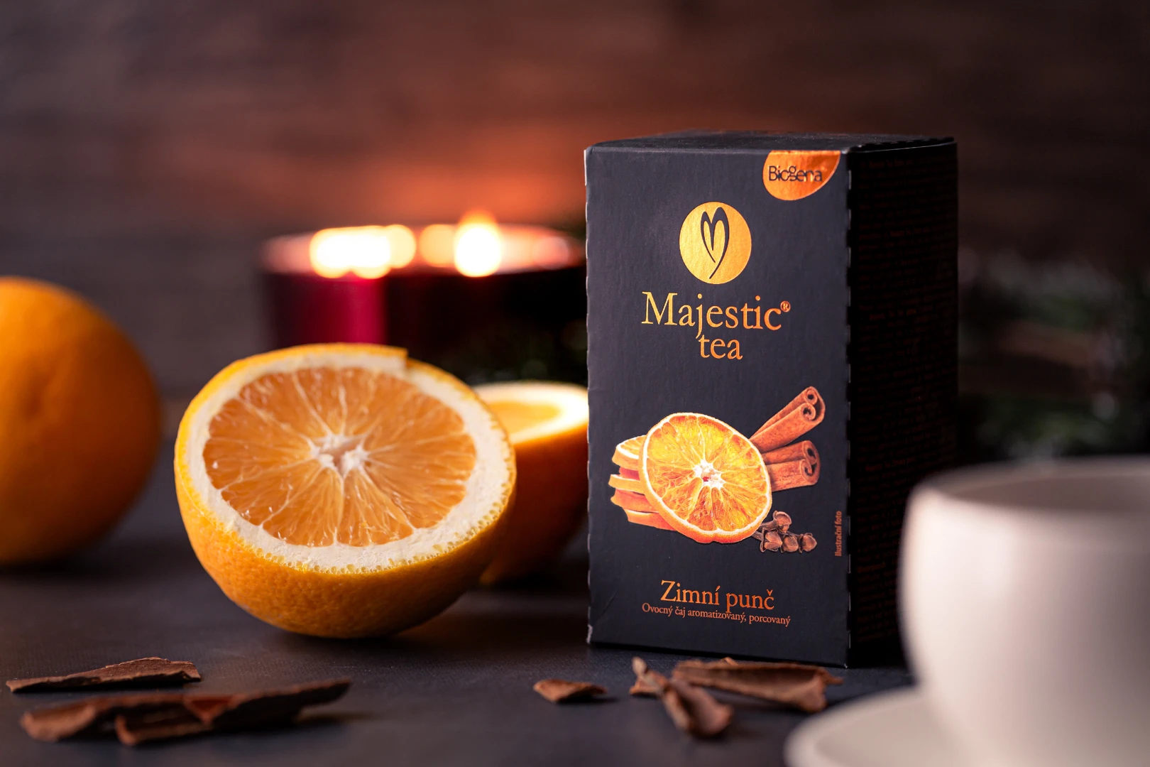 Biogena Majestic Zimní punč – spojení pomeranče, skořice a Vánoc v čaji, který zahřeje a pohladí.
