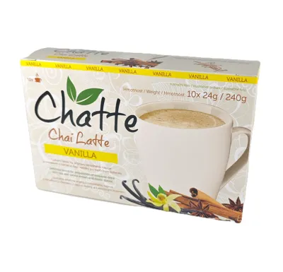 CHATTE - Chai Latte Vanilla v sobě snoubí dávnou indickou tradici čaje s mlékem a nejnovější trendy ochucování nápojů zajímavými, pikantními a zdravými přísadami z bylin. Je to luxusní směs s extraktem z černého čaje, vanilky a přírodního aromatického koření.