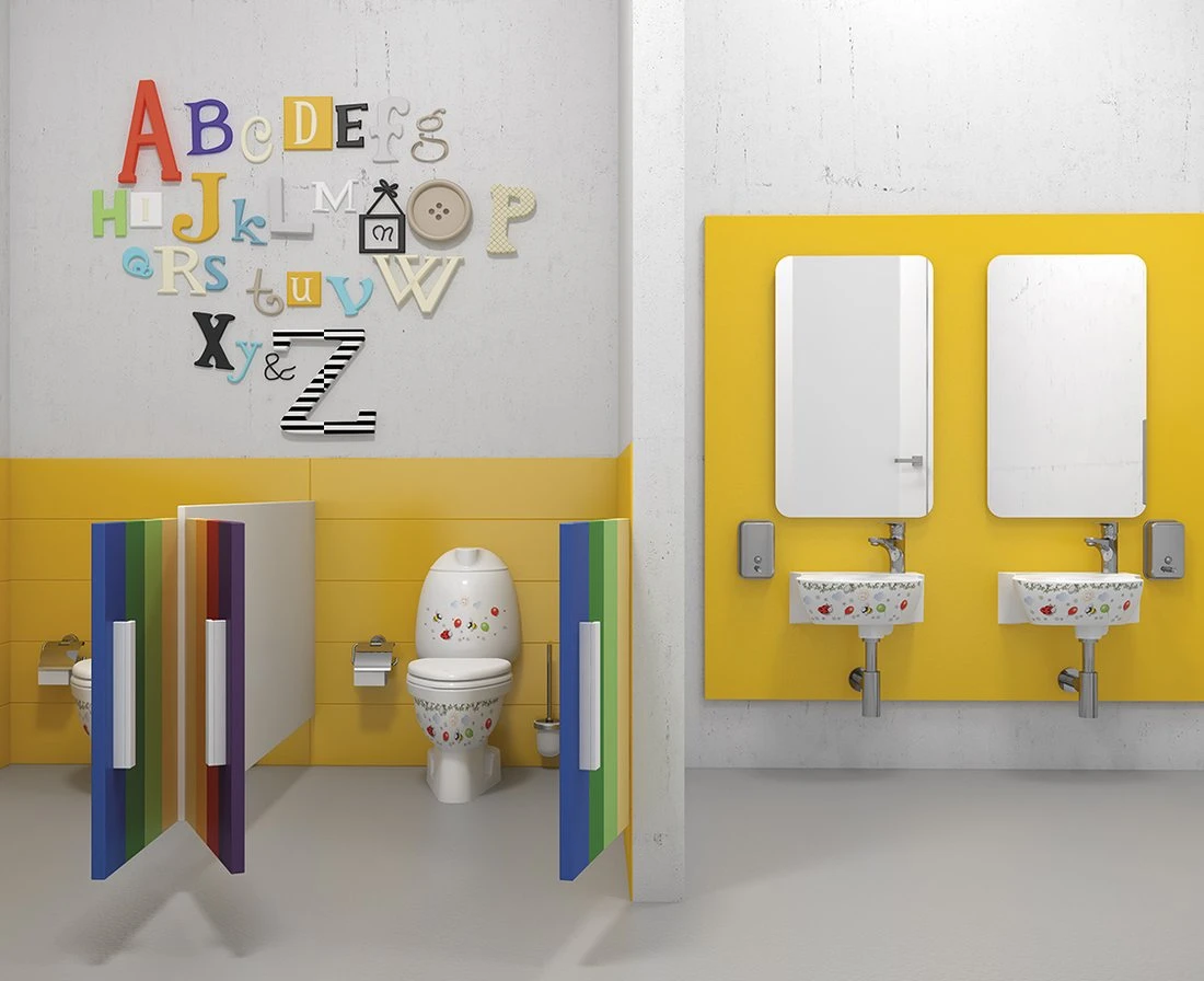 Série dětské keramiky KID je vhodná nejen pro jesle či mateřské školky, ale nalezne své místo i ve standardní koupelně a všude tam, kde je běžná keramika pro děti příliš velká. Lze volit bílou keramiku nebo veselý barevný potisk, který jistě vykouzlí úsměv na tvářích všech malých uživatelů.