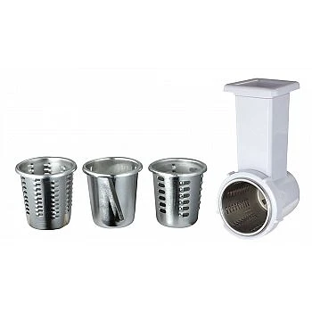 - násypka, 2x nástavec na podávání surovin-pěchovač, nástavec na plnění uzenin, nástavec na směšování, tělo struhadla, 3 protlačovací sítka, 2 nástavce na strouhání (jemné/hrubé), 1 nástavec na plátkování