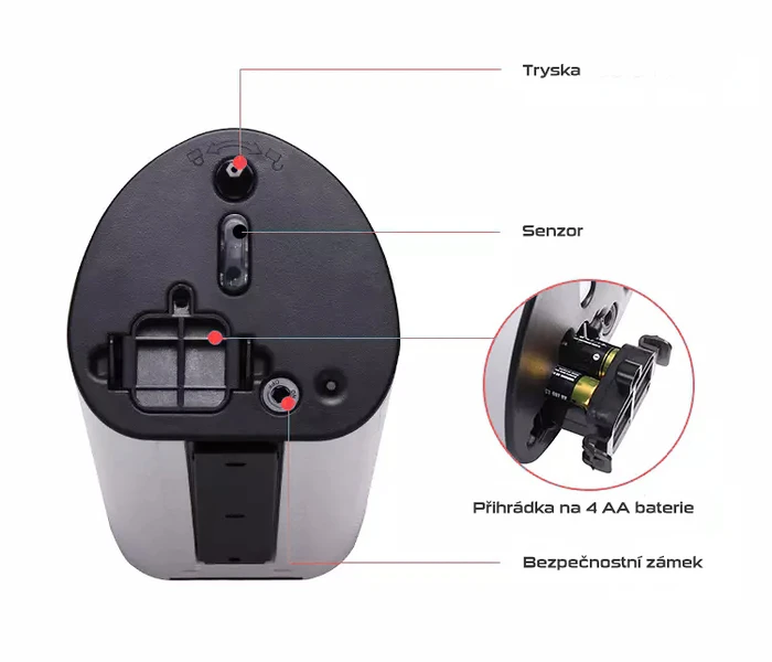 Tělo přístroje je vyrobeno z ABS plastu, který je hladký a odolný. V rámci běžného úklidu stačí automatický dávkovač otřít hadříkem s běžným čistícím prostředkem. Tryska je vyjímatelná, pro možnost propláchnutí.
