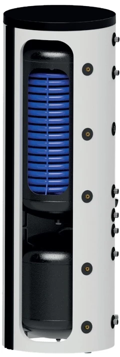 Stacionární kombinovaný zásobník vhodný pro připojení k tepelným čerpadlům a dalším nízkoteplotním zdrojům. V horní části zásobníku je smaltovaný ohřívač vody s výměníkem a v dolní části je vyrovnávací akumulační nádrž pro topný okruh.