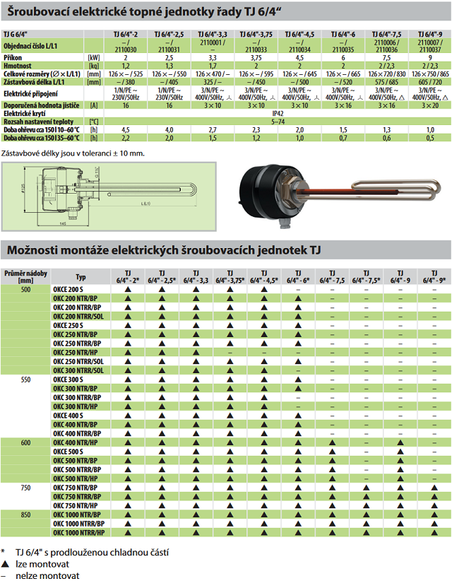 Elektrická šroubovací topná jednotka řady TJ je samostatné elektrické topné zařízení na vodu vybavené topným tělesem, provozním a bezpečnostním termostatem. Připojuje se na hrdlo se závitem G 6/4''.