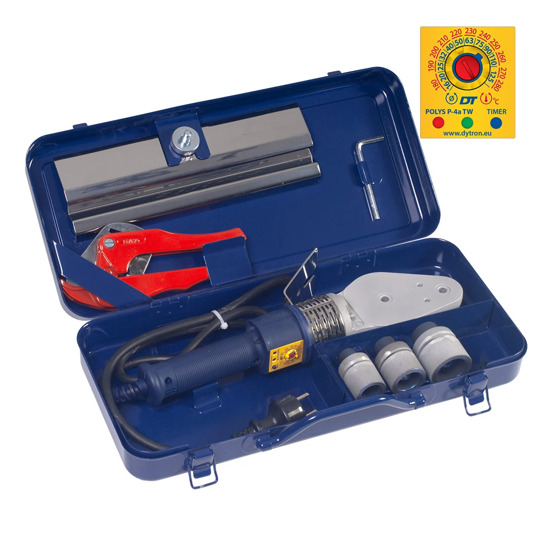Model Dytron Svářecí komplet P-4a 850W TraceWeld MINI KOMPLET (20-32) je profesionální polyfúzní svářečka pro plastové potrubí s nožovým topným tělesem, vybavená funkcí TraceWeld (akustický průvodce svarem).