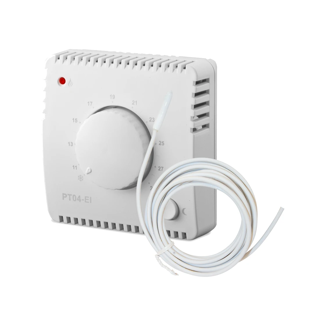 * PT04 je jednoduchý elektronický prostorový termostat pro manuální regulaci vytápění, s možností automatického nočního útlumu teploty a externím podlahovým čidlem