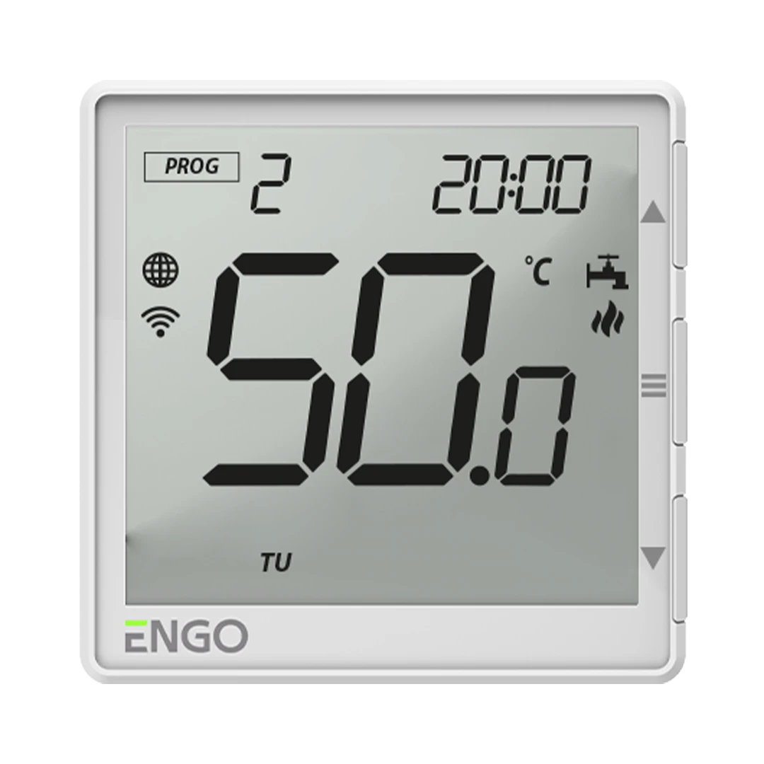 ENGO EHW-W je inteligentní Wi-Fi spínač s vestavěným termostatem, určený pro efektivní řízení přípravy teplé užitkové vody (TUV). Elegantní bílé provedení s lesklým povrchem a minimalistickým displejem se dokonale sladí se světlými interiéry a moderními koupelnami či technickými místnostmi.