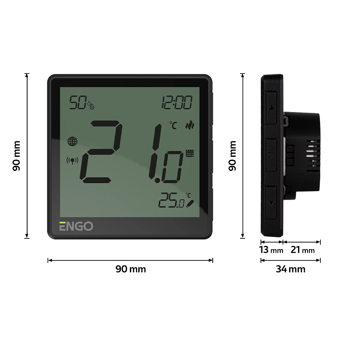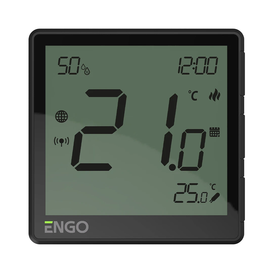 ENGO Controls EONE-230B v luxusním černém provedení představuje špičkový drátový termostat (230V), který se vyznačuje stylovým vzhledem, intuitivním dotykovým ovládáním a pokročilou regulací.