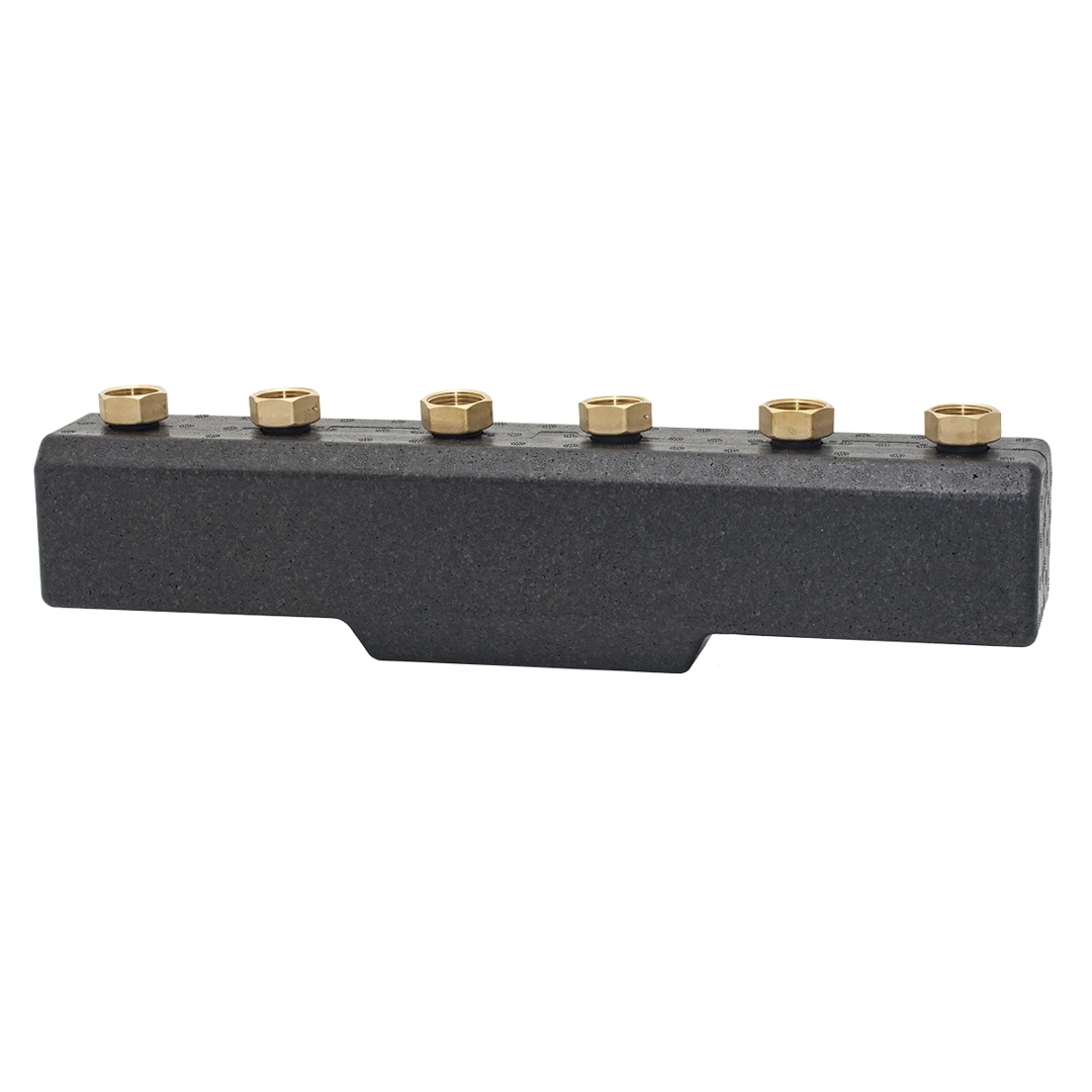 Obsah balení: Tělo rozdělovače pro 3 okruhy, izolační kryt EPP, sada pro montáž na stěnu, plochá těsnění.
