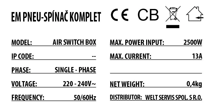 Komponenty: Pneuspínač - elektronická vnitřní část, flexo - přívodní kabel s vidlicí na zásuvku, ovládací tlačítko se vzduchovým měchem, cca 2m vzduchová hadička.