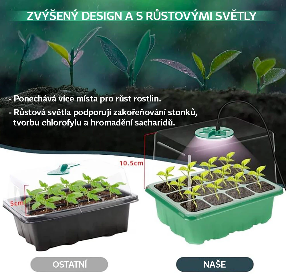 Stačí naplnit buňky kvalitní zeminou, zasaďte semínka, zakryjte krytem a zapojte růstové světlo. S přiloženými miniaturními zahradními nástroji a etiketami bude pěstování hračka.