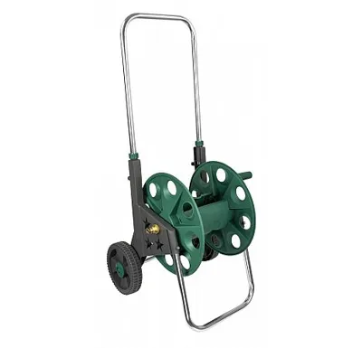 Naviják a stojan pro úsporné skladování zahradní hadice. Vozík má kolečka pro snadný transport, pohodlné navíjení pomocí kliky.