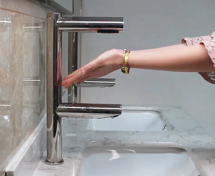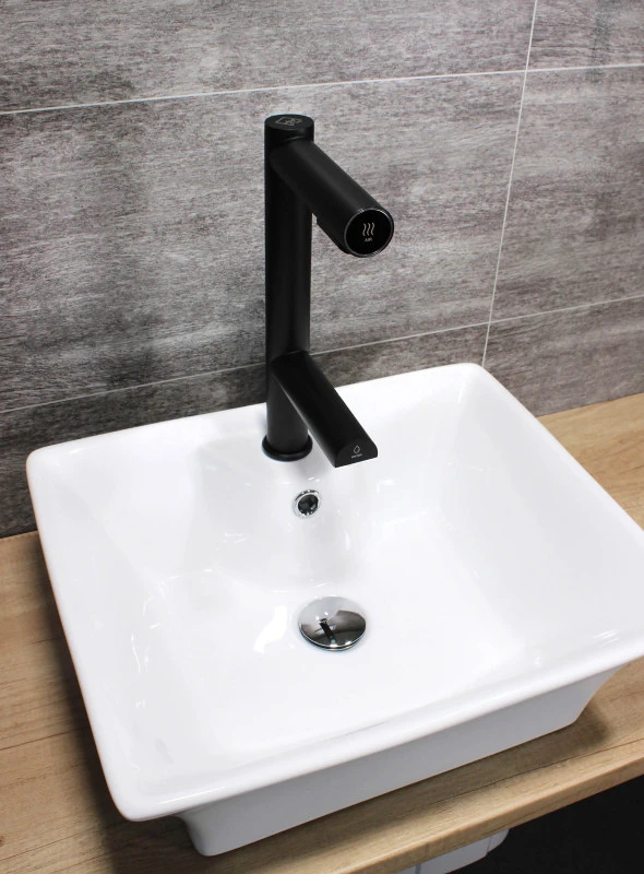 Hygienické umytí a osušení rukou nebylo nikdy jednodušší. Vložením rukou pod vodovodní baterii začne automaticky téct voda o předem nastavené teplotě. Hned nad automatickou baterií se nachází vyústění trysky vysoušeče. Spuštění je také bezkontaktní, stačí vsunout ruce a pohybovat s nimi podobně jako při mytí. Na přední části ramena vysoušeče se nachází podsvětlený kroužek. Kroužek pulzuje bílým světlem, čímž upozorňuje na funkci vysoušeče. Při používání svítí modře.