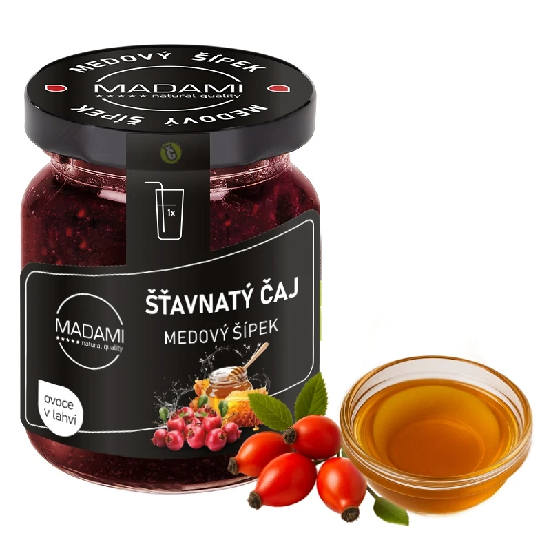 Pitná voda, rybíz červený, cukr, šípky sušené (9,4%), med včelí (8%), koncentrát červeného rybízu, šípkový koncentrát (2,7%), šípkový extrakt (1,3%), barvicí koncentrát z červené řepy, barvivo: betakaroten, zahušťovadlo: guma guar, xanthanová guma, alginán sodný, konzervant: sorban draselný, antioxidant: askorban sodný, aroma
