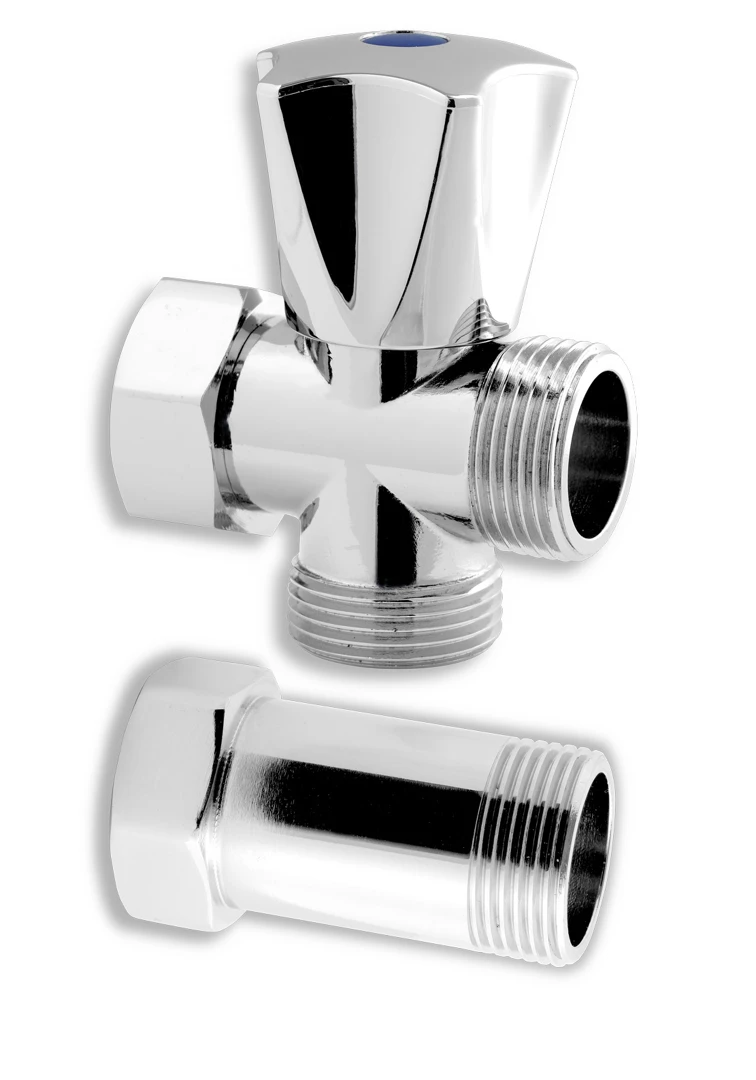 Pračkový rohový ventil se zpětnou klapkou a krytkou.