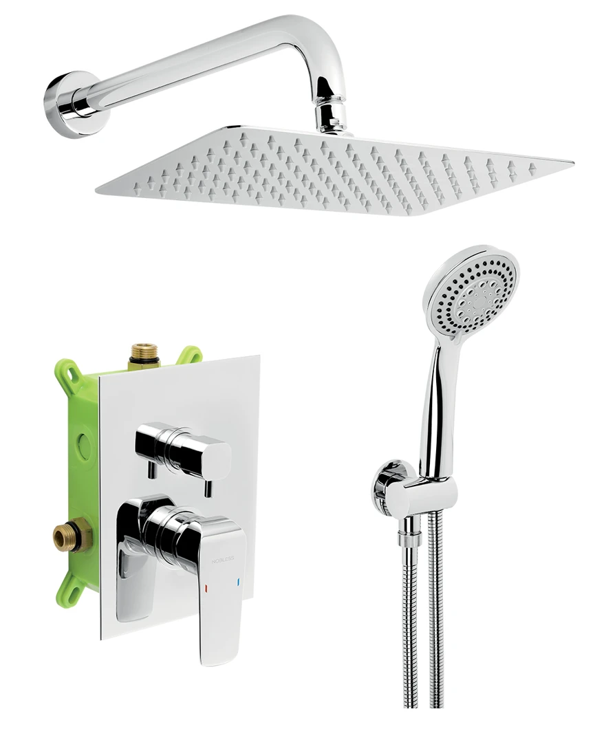 Sprchový set obsahuje baterii se sprchovou soupravou, jednopolohovou ruční a kulatou talířovou sprch...