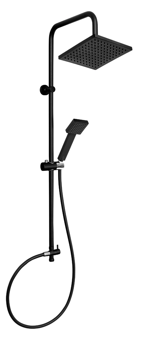 Prvotřídní provedení černá-mat. Set obsahuje plastovou hadici 150 cm, hlavovou sprchu 200 x 200 mm, ruční sprchu a posuvný jezdec s držákem ruční sprchy. Výška setu je 1125 mm. Set umožňuje nastavit odchýlení vrchního úchytu od stěny v rozmezí 60 - 80 mm.