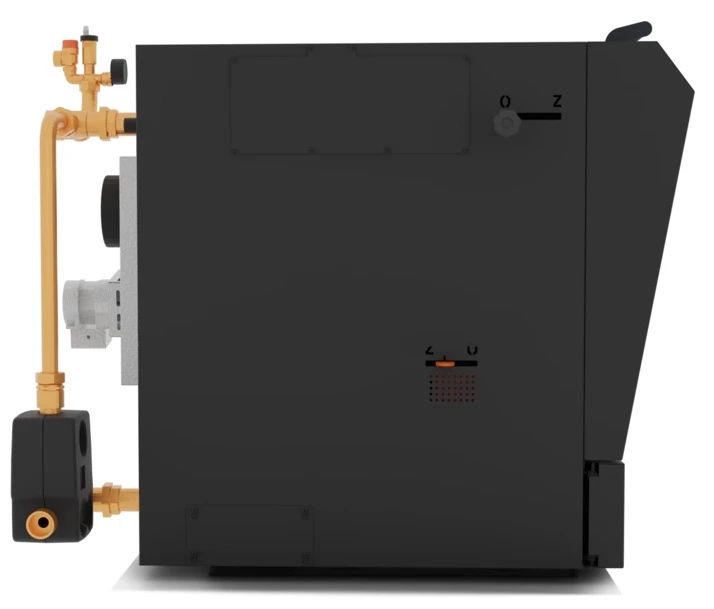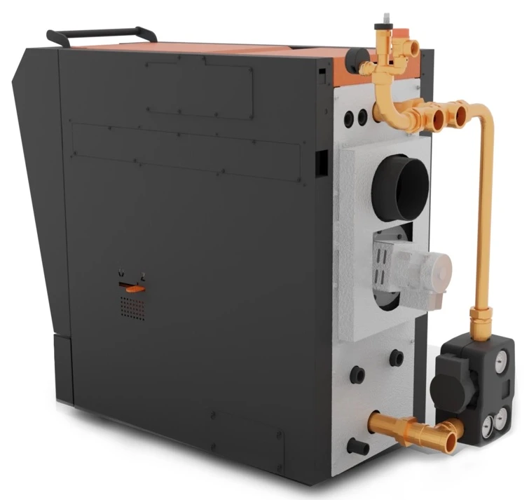 Kotel s kompletně připraveným připojením na topný systém obsahující hydraulický set se směšovacím ventilem, čerpadlo a ochranné prvky. Hydraulický set je dodáván zvlášť.