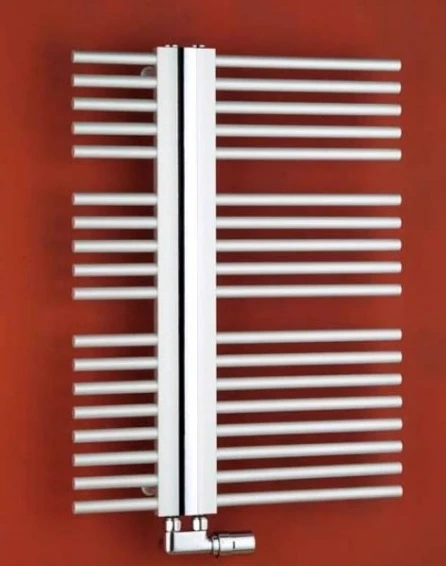 Patentovaný radiátor do koupelny je tvořen z hliníkového dvoukomorového profilu s povrchovou úpravou pískovaný stříbrný elox a designovou středovou lištou v provedení lesklý chrom nebo nerez efekt.