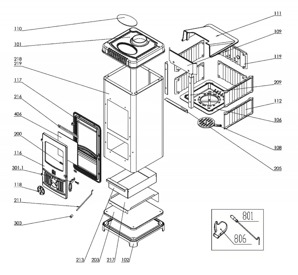 Kamna jsou pečlivě utěsněna a mají vyjímatelnou nádobu na popel. Dveře, rám a krycí plech jsou vyrobeny z kvalitní litiny. Boční panely jsou vyrobeny z vysoce kvalitního, smaltovaného ocelového plechu. Oddělený přívod primárního a sekundárního vzduchu zajišťuje optimální energetický výnos.