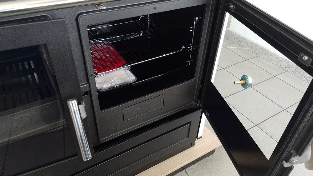 Můžete vařit přímo nad plamenem po odstraněním kroužku v horní části sporáku. Vpravo nahoře se nachází pečicí prostor a přípojka kouřovodu 120 mm. Kouřovod se nachází uprostřed nahoře. Kouřovody lze čistit bez demontáže kouřovodu.
