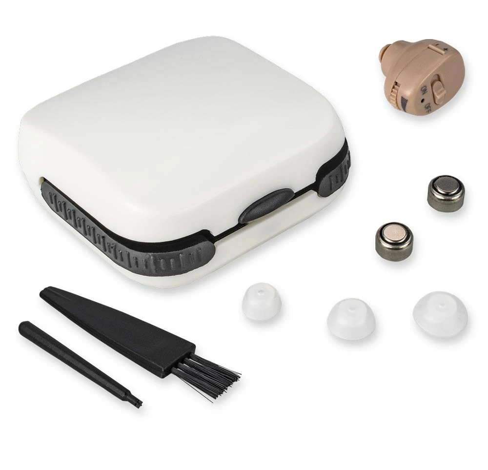 3 hygienické koncovky do ucha, 2 ks baterie A10, čistící kartáček, plastový čistič, praktické pouzdro